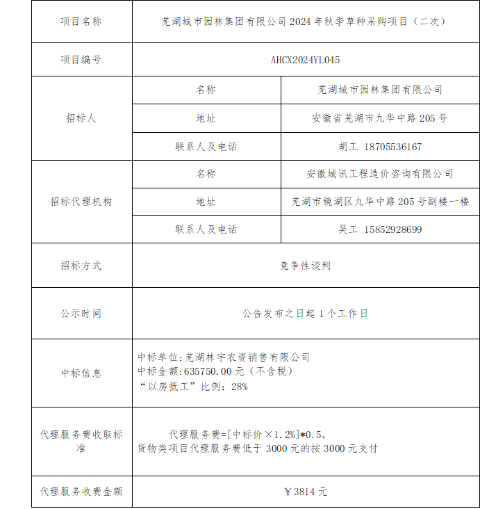 蕪湖城市園林集團有限公司2024年秋季草種采購成交結果公告(二次)