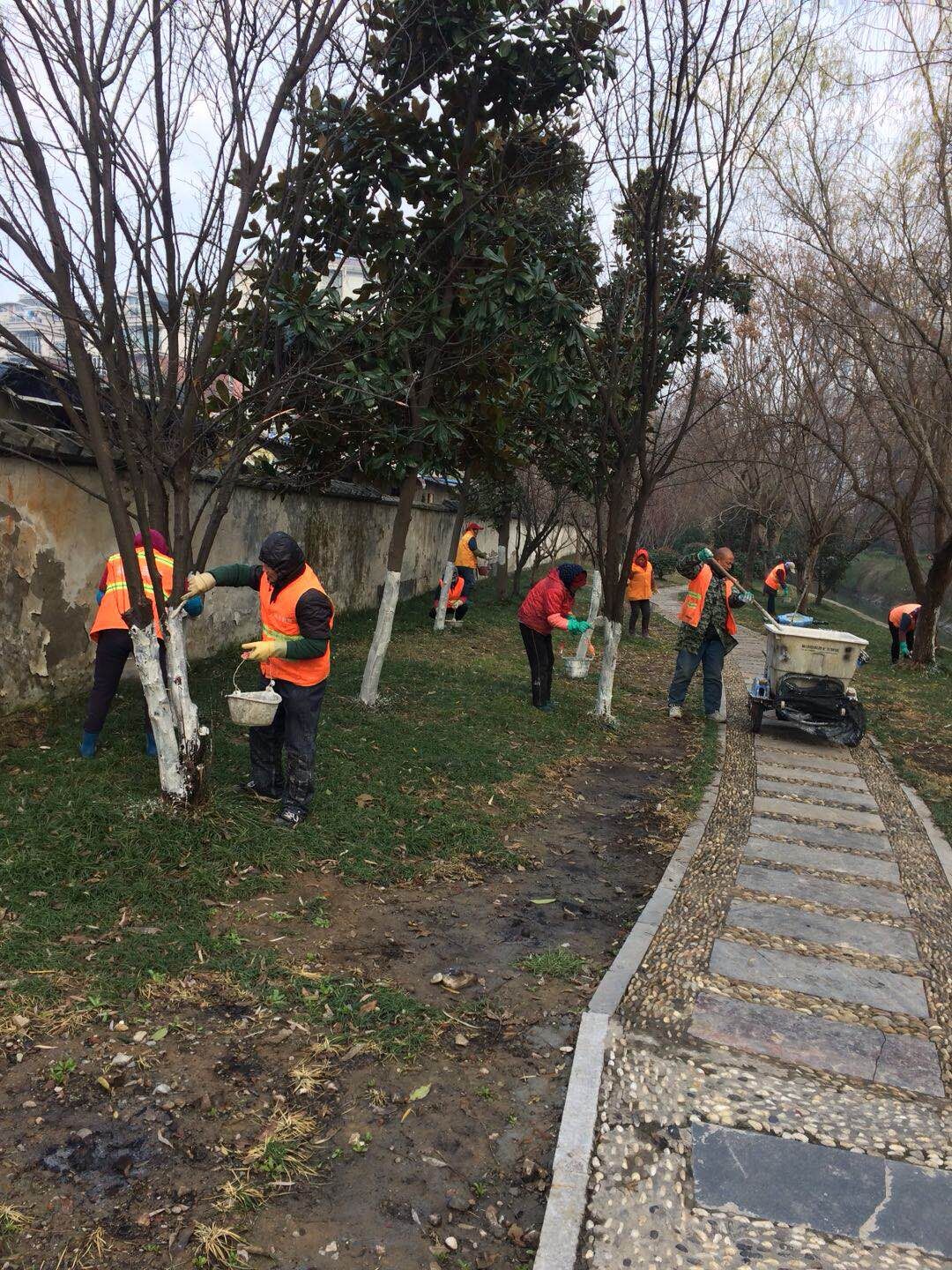 樹(shù)木涂白,為過(guò)冬撐起一把“保護傘”。冬季樹(shù)木涂白能有效防止樹(shù)木的凍害,防止病菌侵入,可以殺死寄生在樹(shù)干上的一些越冬的真菌、細菌和害蟲(chóng),提高樹(shù)木的抗病能力,起到防凍殺蟲(chóng)的雙重作用。在涂白施工中,園林工人對涂白劑進(jìn)行科學(xué)配比,涂層薄厚均勻,統一高度,涂白后的樹(shù)木整齊美觀(guān)。