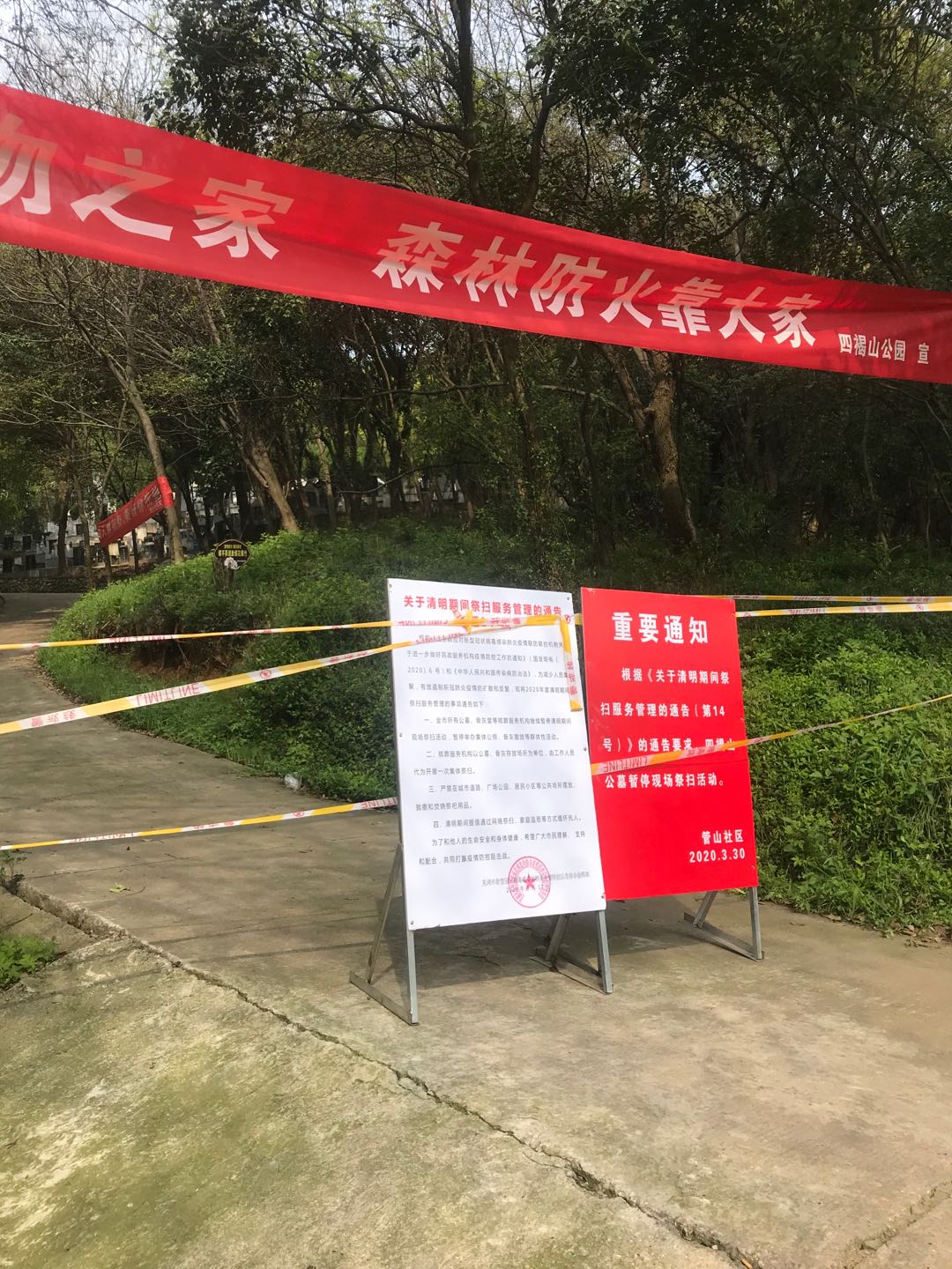 現神山公園、四褐山公園山林的主要進(jìn)山路口已設點(diǎn)封閉,重點(diǎn)地段也安排了專(zhuān)門(mén)的防火人員,配備滅火器材,并在顯眼處懸掛防火宣傳標語(yǔ)。防火人員在重點(diǎn)時(shí)段、重點(diǎn)山頭、墳墓集中區對分管區域進(jìn)行巡查,對前來(lái)祭掃的市民進(jìn)行防火知識的宣傳,并倡導文明低碳綠色祭祀,嚴禁一切野外用火。