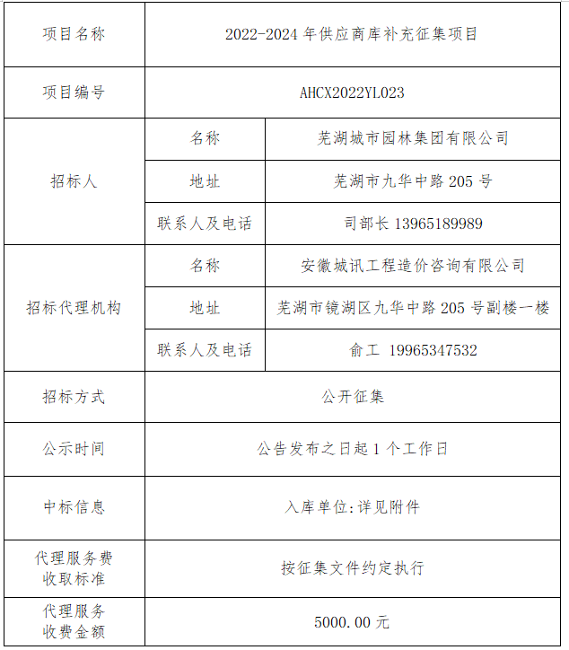 2022-2024年供應商庫補充征集項目中標公告