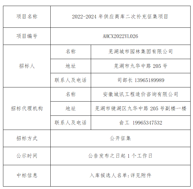 2022-2024年供應商庫二次補充征集項目中標結果公告
