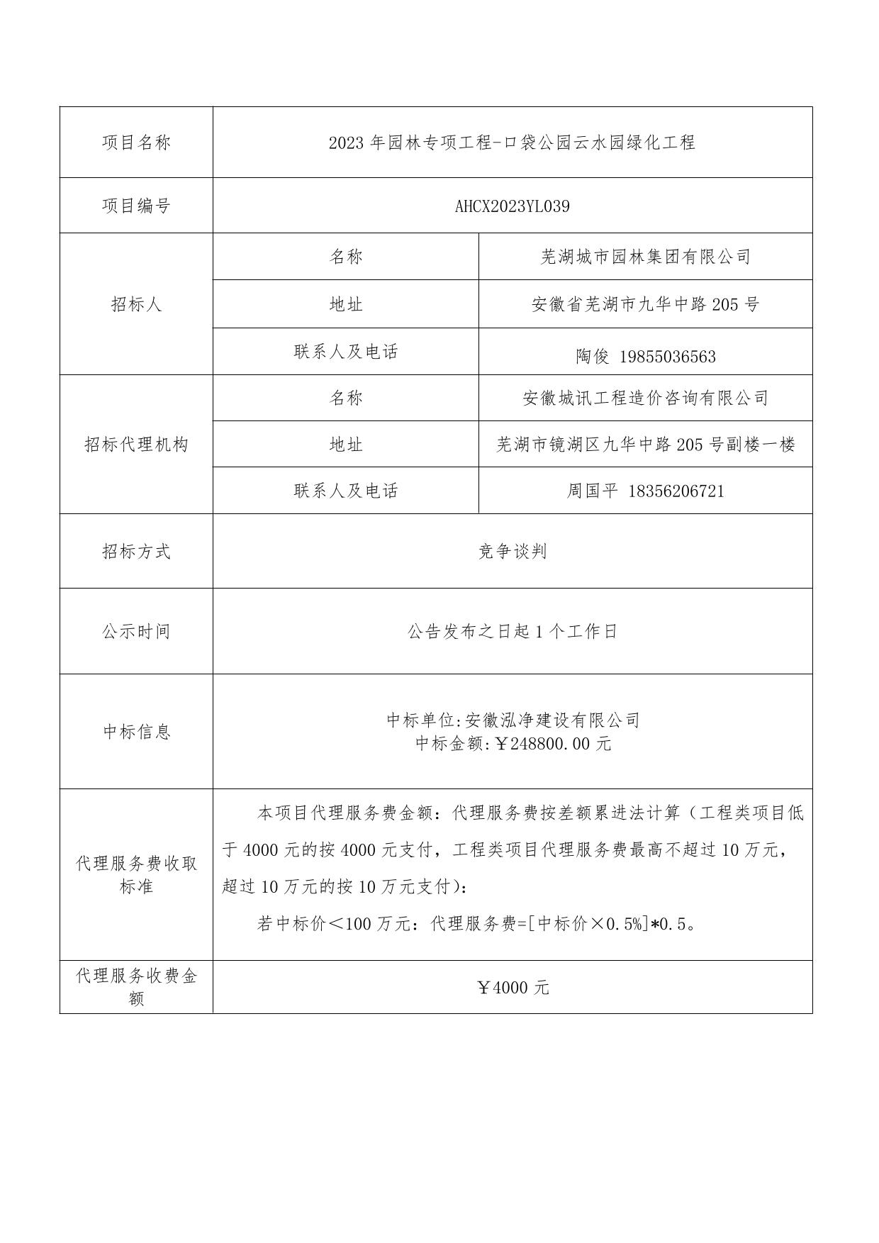 2023年園林專(zhuān)項工程-口袋公園云水園綠化工程中標結果公示