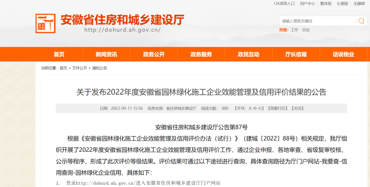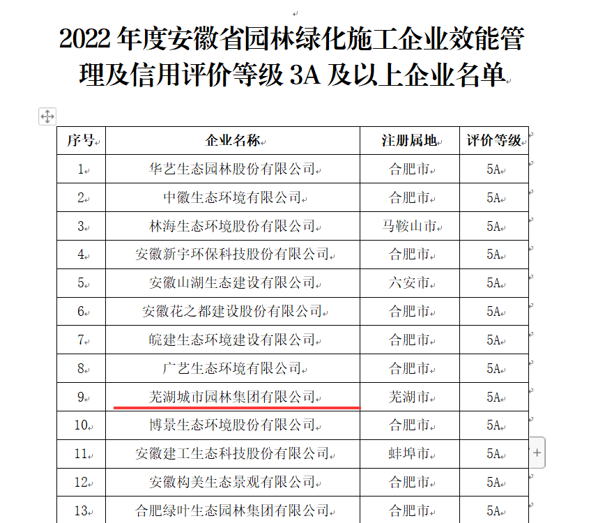 近日,2022年度安徽省園林綠化施工企業(yè)效能管理及信用評價(jià)結果公布,蕪湖城市園林集團有限公司榮獲5A等級(最高)評價(jià)。