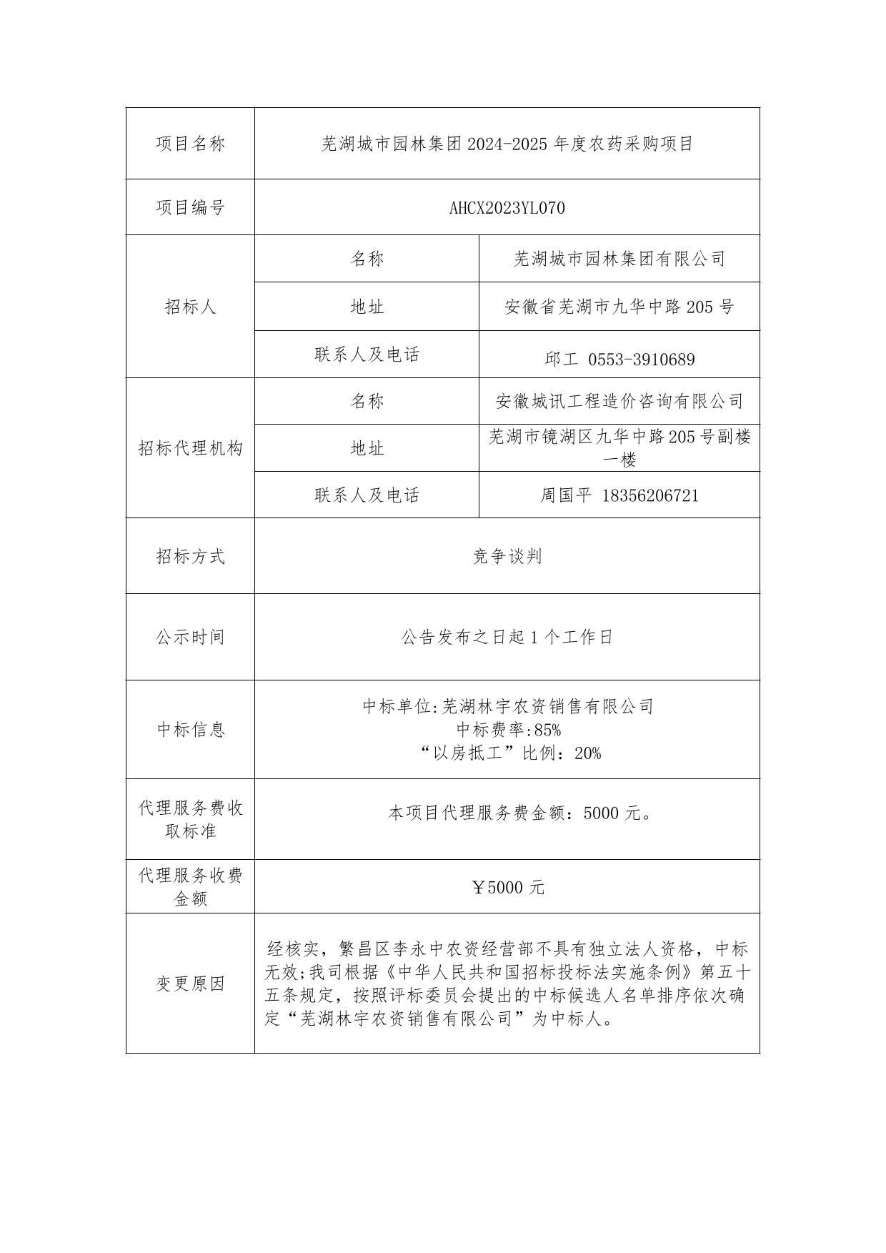 蕪湖城市園林集團2024-2025年度農藥采購項目成交結果變更公告